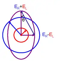 La luz polarizada elíptica (violeta) está compuesta por contribuciones desiguales de luz polarizada circular derecha (azul) e izquierda (roja).