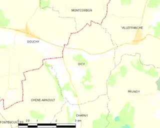 Dicy era una comuna francesa situada en el departamento de Yonne, de la región de Borgoña-Franco Condado, que el 1 de enero de 2016 pasó a ser una comuna delegada de la comuna nueva de Charny-Orée-de-Puisaye[3] al fusionarse con las comunas de Chambeugle, Charny, Chêne-Arnoult, Chevillon, Fontenouilles, Grandchamp, Malicorne, Marchais-Beton, Perreux, Prunoy, Saint-Denis-sur-Ouanne, Saint-Martin-sur-Ouanne y Villefranche.