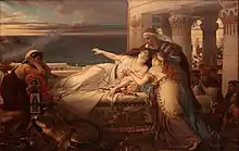 Mientras tanto, el troyano Eneas, habiendo sido destruida su patria por los griegos, cuando se dirigía a Italia fue arrastrado por una tempestad hasta las orillas de África, siendo allí recogido y cuidado por Dido, la cual se enamoró de él ardientemente; pero mientras este se complacía y se demoraba en Cartago por el cariño de la misma, los dioses le ordenaron que abandonara aquel cielo y que continuara su camino hacia Italia donde le prometieron que habría de resurgir una nueva Troya. Él partió, y Dido, desesperadamente, después de haber intentado en vano retenerlo, se suicidó.