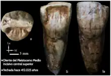 Esta característica dental en forma de pala es también observada en los Homo erectus como el hombre de Pekín y en los Neandertales, aunque la morfología de estos incisivos en forma de pala es distinto al de los humanos modernos.[4][5][6] La morfología de los dientes en forma de pala en los Neandertales, han sido vistos como una adaptación al uso intensivo de sus caninos e incisivos en el procesamiento y masticación de alimentos, y el uso de sus dientes para actividades distintas a la alimentación.[7]