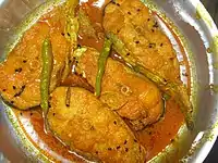 Los hindúes no-vegetarianos prefieren aves de corral, pescado, otros mariscos, cabras y corderos como fuentes de carne.[56] En las regiones de Bengala y Assam, el pescado es un elemento básico de la mayoría de las comunidades, incluidos los brahmanes.[57][58] El pescado también es el alimento básico de la comunidad Saraswat Brahmin de la costa sudoeste de la India.[59][60] Sin embargo, debe tenerse en cuenta que en otras partes de la India, incluso los hindúes que comen carne tienen comidas lacto-vegetarianas la mayoría de los días.[61] Según un estudio patrocinado por las Naciones Unidas, el principal determinante del consumo de carne per cápita parece ser la riqueza. Los países del sur de Asia tienen un consumo muy bajo de carne, huevo y pescado en comparación con las naciones ricas como los Estados Unidos.[62] En general, India consume el menos cantidad de la carne per cápita.[63]