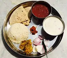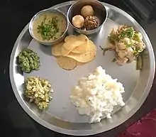 Una comida lacto-vegetariana hindú urbana moderna típica se basa en una combinación de granos como el arroz, el trigo, las legumbres, verduras y productos lácteos.[47] Dependiendo de la región geográfica, los alimentos básicos pueden incluir panes planos a base de mijo. Se evita la grasa derivada de animales sacrificados.[44]