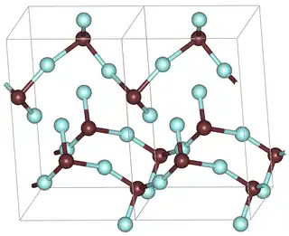 El difloruro de germanio forma cristales ortorómbicos con un grupo espacial P212121 (No. 19), símbolo Pearson oP12, y constantes de red de a = 0.4682 nm, b = 0.5178 nm, c = 0.8312 nm, Z = 4 (4 unidades estructurales por celda). Su estructura cristalina es caracterizada por fuertes cadenas polímericas compuestas de pirámides de GeF3 pyramids. Uno de los átomos de floruro en la pirámide es compartido por 2 cadenas contiguas, proveyendo un débil enlace entre ellos.[3] Otro cristal poco común formado de GeF2 tiene una simetría tetragonal con un grupo espacial P41212 (No. 92), símbolo Pearson tP12, and constantes de red de a = 0.487 nm, b = 0.6963 nm, c = 0.858 nm.[4]