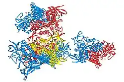 ![]() Estructura 3D de tres unidades de dihidrolipoildeshidrogenasa. PDB 1ZMC. | ||||