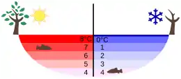 En los países fríos, cuando la temperatura del agua dulce alcanza 4 °C, las capas de agua cerca de la superficie en contacto con el aire frío continúan perdiendo energía calorífica y su temperatura cae por debajo de 4 °C. Al enfriarse por debajo de 4 °C, estas capas no se hunden, puesto que su densidad se reduce. Debido a esto, la capa de agua a 4 °C se mantiene en la parte inferior y por encima de esta, se forman capas de agua a 3 °C, 2 °C, 1 °C y 0 °C. Como el agua a 0 °C es menos densa, flota en la parte superior y se convierte en hielo, mientras el agua sigue enfriándose. El crecimiento del hielo continúa en su cara inferior debido al flujo de calor a través del propio hielo (la conductividad térmica del hielo es similar a la del vidrio). El agua más profunda por debajo del hielo se mantiene todavía a 4 °C. A medida que la capa de hielo protege al lago del efecto del viento, el agua ya no se desplaza más. Aunque tanto el agua como el hielo son relativamente buenos conductores del calor, una capa gruesa de hielo y una capa gruesa de agua estratificada bajo el hielo ralentizan aún más la pérdida de calor del lago con relación a cuando estaba expuesto. Por lo tanto, es poco probable que los lagos suficientemente profundos se congelen por completo, a menos que se agiten por las fuertes corrientes generadas al mezclarse el agua a distintas temperaturas, lo que aceleraría el enfriamiento.