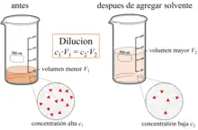 En química, la dilución es la reducción de concentración de una sustancia química en una disolución.
