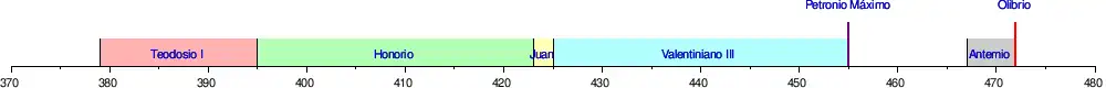 | Antemiolo | Procopio Antemio | Rómulo | Dinastía de León | 1. Paladio | Eudocia | 2. Hunerico, Rey de los vándalos | Placidia | Anicio Olibrio (r. 472) | |||||||||||||||||||||||||||||||||||||||||||||||||||||||||||||||