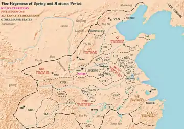Después de mover la capital hacia el este, la familia real de Zhou cayó en un estado de declive. Además, la popularidad del rey Ping disminuyó debido a los rumores de que había matado a su padre. Con los vasallos haciéndose cada vez más poderosos, fortaleciendo su posición al derrotar a otros estados rivales e incrementando la invasión de los países vecinos, el rey de Zhou no pudo dominar el país. Constantemente, tendría que recurrir a los poderosos vasallos en busca de ayuda. Los vasallos más importantes (conocidos más tarde como los doce vasallos) se reunían en conferencias regulares donde decidían asuntos importantes, como expediciones militares contra invasores extranjeros o contra nobles ofensores. Durante estas conferencias, un gobernante vasallo a veces era declarado hegemon. El canciller Guan Zhong de Qi inició una política de "reverenciar al rey, expulsar a los bárbaros" (chino: 尊王攘夷, ver Sonnō jōi). Adoptando y adhiriéndose a él, el duque Huan de Qi reunió a los vasallos para derribar la amenaza de los bárbaros del país. Durante el Período de los Reinos Combatientes, muchos de los líderes de los vasallos que clamaban por la realeza limitaron aún más la influencia de la familia real Zhou.[4][5]