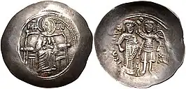 Aspro que representa a la Virgen María (izquierda) e Isaac II Ángelo (derecha), primer gobernante de la dinastía imperial Ángelo, coronado por san Miguel Arcángel.