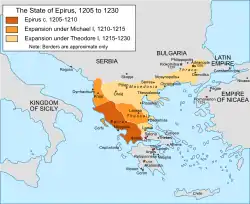 Después de la caída de Constantinopla y el establecimiento del Imperio Latino en 1204, el hijo ilegítimo de Juan Ducas, Miguel I Comneno Ducas, fundó el Despotado de Epiro en 1205 eligiendo la ciudad de Arta como su capital.[18] Inicialmente vasallo y aliado de los latinos, Miguel I expandió sus territorios en el noreste de Grecia hasta su muerte en 1215, cuando fue sucedido por su medio hermano Teodoro Comneno Ducas. En 1224, Teodoro capturó el Reino de Tesalónica en manos de los cruzados y se proclamó emperador bizantino legítimo (basileus) en sus posesiones. Epiro apareció como un serio contendiente por el trono bizantino, pero Teodoro fue derrotado y capturado por Juan II Asen en la batalla de Klokotnitsa en 1230 y su imperio declinó rápidamente tras las derrotas en Macedonia y Tracia. Durante el cautiverio de Teodoro, su hermano Manuel gobernó Tesalónica, sucedido por los hijos de Teodoro, Juan y Demetrio. En 1242, el emperador de Nicea Juan III Ducas Vatatzés obligó a Juan a abandonar el título imperial (conservando sólo el título de déspotas),[19] y en 1246 Tesalónica fue capturada por Nicea, lo que marcó el fin del gobierno angelida en gran parte del norte de Grecia.[20]