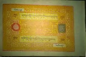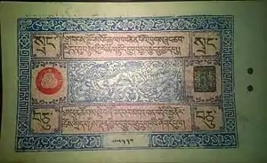 - 1658 años desde la fundación de la forma de gobierno religioso - secular en el gran país del Tíbet, la tierra de las nieves, el papel moneda (shog dngul) del ciclo 15 (rab byung bco lnga) del gobierno de religión y política (chos srid gnyis ldan), la joya universal (spyi nor) de beneficio y bendición, dotada de los cuatro tipos de auspiciosidad. [19][20]