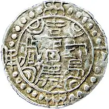 Moneda sino-tibetana de medio sho, fechada en el año 57 de la era Qianlong, anverso. Esta es un diseño de moneda que no fue autorizada por las autoridades imperiales de China, ya que tiene inscripciones en tibetano de ambos lados. En el siguiente año 58 (1793) se inició la emisión regular de monedas sino-tibetanas que tenían una inscripción en Chino en el anverso y una leyenda en tibetano en el reverso.