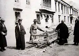 Además, una casa de moneda llamada gser khang ("casa del oro"), ubicada al oeste de Norbulingka, estaba en operaciones en la década de 1920 para la acuñación de monedas de oro y cobre. Una ceca conocida como Mekyi (en tibetano me kyid; abreviatura de me tog skyid po que significa "flores agradables") estaba ubicada en la residencia del Amban chino y quizás fue utilizada por los chinos en 1910 para acuñar monedas sino-tibetanas. Fue asumido por el gobierno tibetano después de la partida forzada del último Amban en 1913, y allí se acuñaron monedas entre 1914 y principios de la década de 1930. Un establecimiento ubicado al sur del (río) Kyichu cerca de Lhasa, conocido como Tip Arsenal, se menciona ocasionalmente como "ceca",[21] aunque no hay evidencia de que allí se acuñaran monedas. Una pequeña fábrica destinada a la producción de piezas en bruto de cobre existía en el valle de Chumbi a medio camino entre Yatung y la frontera entre Tíbet y Sikkim; su nombre era Norbu Tsoki (en tibetano: ni bu mthso dkyil ) y estuvo operativa entre 1923 y 1928.