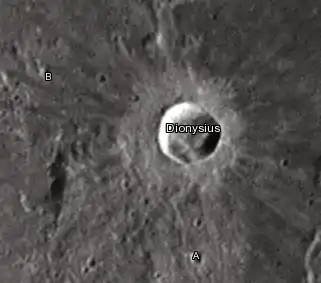 Dionysius es un cráter de impacto lunar que se encuentra en el borde occidental del Mare Tranquillitatis. Al sureste se halla el par de cráteres Ritter y Sabine. Justo al noroeste aparece el sistema de grietas designado Rimae Ritter. Estas hendiduras siguen una dirección generalmente al noroeste.