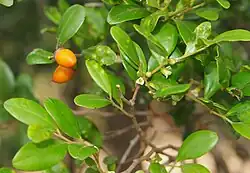 La planta crece como un árbol pequeño o arbusto, con hojas rígidas, brillosas y discolorosas. Los frutos son ovales, amarillos brillosos y con una gama de colores cuando maduros.