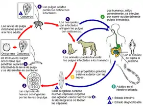 Para desarrollarse el parásito necesita de dos huéspedes: un huésped intermedio, la pulga, y uno final, normalmente un mamífero. En las heces del huésped final se encuentran proglótidos, conteniendo gran cantidad de huevos, que son ingeridos por las larvas de las pulgas, cuyo aparato masticatorio se presta a esta operación (los huevos de Dipylidium caninum pueden ser ingeridos por la pulga canina o felina sólo en su fase larvaria puesto que en el estado adulto su aparato bucal tiene forma de sifón capaz únicamente de ingerir líquidos, como la sangre). Una vez en el interior de la pulga el parásito se desarrolla a su siguiente fase, la oncosfera, que penetra la pared intestinal y con el tiempo se desarrolla hasta el estado cisticercoide. El cisticercoide, que carece de cola, es el estado capaz de infectar al siguiente huésped. En esta fase la supervivencia de las larvas es muy dependiente de la temperatura ambiental.