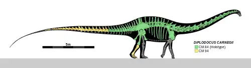 Diplodocus carnegii ("doble viga de Andrew Carnegie") es una especie del género extinto Diplodocus de dinosaurio saurópodo diplodócido. Vivió a finales del período Jurásico, hace aproximadamente entre 155,3 y 145 millones de años, en edades geológicas entre Kimmeridgiense y Titoniense, en lo que hoy es Norteamérica. El espécimen tipo de Diplodocus carnegii, cuya sigla es CM 84, es el más completo hallado de su género. Sus restos permiten estimar su longitud en alrededor de 25 metros de[2] y en 6.5 m de alto al cuello.[3][4][5] Las estimaciones de masa modernas tienden a estar en el rango de 10 a 16 toneladas métricas.[5][6][7][8][9]