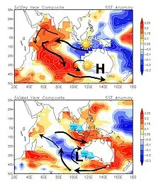 Los años secos (húmedos) del suroeste de Australia corresponden a aguas anormalmente frías (cálidas) en el Océano Índico tropical/subtropical y aguas anormalmente cálidas (frías) en los subtrópicos frente a Australia, y estas parecen estar en fase con los vientos a gran escala sobre el Océano Índico tropical/subtropical, que modifica las anomalías de TSM a través del transporte anómalo de Ekman en el Océano Índico tropical y a través de flujos anómalos de calor aire-mar en los subtrópicos, que también alteran la advección de humedad a gran escala a la costa suroeste de Australia.[4]