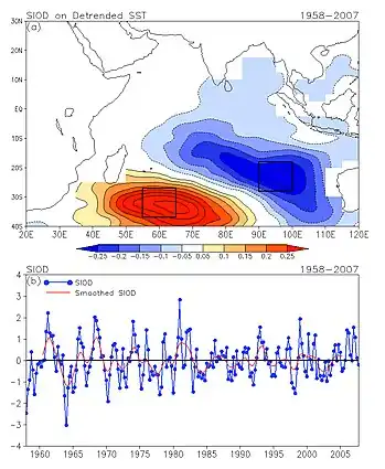 El índice dipolo del océano Índico subtropical se calcula a partir de la diferencia de anomalías de la TSM entre el océano Índico occidental (55°E - 65°E, 37°S - 27°S) y oriental (90°E - 100°E, 28°S - 18°S).[1]