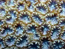 Contienen algas simbióticas; mutualistas (ambos organismos se benefician de la relación) llamadas zooxantelas. Las algas realizan la fotosíntesis produciendo oxígeno y azúcares, que son aprovechados por los pólipos, y se alimentan de los catabolitos del coral (especialmente fósforo y nitrógeno).[6] Esto les proporciona entre el 70 y el 95% de sus necesidades alimenticias. El resto lo obtienen atrapando plancton y materia orgánica disuelta en el agua.