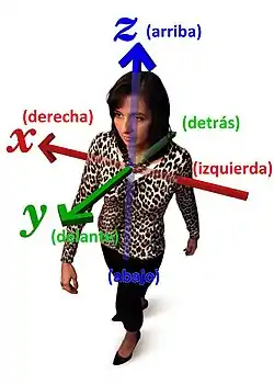 Las direcciones relativas más comunes son izquierda, derecha, delante, detrás, arriba y abajo. Ninguna dirección absoluta se corresponde con ninguna de las direcciones relativas. Esto es una consecuencia de la invariancia traslacional de las leyes de la física: la naturaleza, en términos generales, se comporta de la misma manera, sin importar en qué dirección se oriente el marco en el que se verifica un fenómeno. Como demuestra el resultado nulo del experimento de Michelson y Morley, no hay un marco de referencia inercial absoluto. Sin embargo, hay relaciones definidas entre las direcciones relativas. Izquierda y derecha, adelante y atrás, y arriba y abajo, son tres pares de direcciones complementarias, cada par ortogonal a los otros dos. Estas direcciones relativas también se conocen como coordenadas egocéntricas.[1]