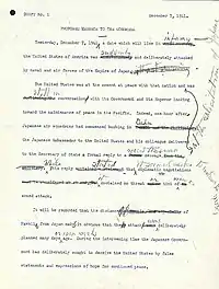 Así pues, el gobierno japonés envió el comunicado de la ruptura de las negociaciones —del que se había suprimido la frase que hablaba de la posible declaración de guerra japonesa de acuerdo con la Convención de La Haya—[6] solo unas horas antes del ataque.[7] El comunicado iba acompañado de la orden de que no lo entregaran antes de la 13:00 horas (horario de Washington; 7:30 horas, horario de Hawái, es decir, justo media hora antes del inicio del ataque). Pero la embajada japonesa tuvo problemas con el descifrado y el mecanografiado del documento, que constaba de catorce puntos y una conclusión final,[8] por lo que Nomura y Kurusu lo presentaron al secretario de Estado Cordell Hull a las 14:20 horas, cuando hacía una hora que el ataque a Pearl Harbor había comenzado —lo que Nomura y Kurusu desconocían ya que su gobierno tampoco les había informado sobre la operación—[9]. Cuando Hull los recibió notaron que éste estaba furioso —ni les dio la mano, ni los invitó a sentarse—.[10] No podían saber que tanto él como el presidente Roosevelt conocían su contenido desde las 10 de la mañana ya que los servicios de inteligencia lo habían interceptado y descifrado antes que la propia embajada japonesa —de hecho hacia las 12 de la mañana los comandantes de las bases navales y terrestres norteamericanas del Pacífico ya habían sido advertidos del inminente ataque japonés, pero no el de Pearl Harbor, a causa de las malas condiciones atmosféricas (el mensaje llegaría cuando el ataque japonés ya había comenzado)— [10]. Además hacía pocos minutos que al secretario de Estado le habían informado que la base de Pearl Harbor estaba siendo atacada por aviones japoneses. En un momento determinado Hull dejó de leer el documento que le habían entregado los representantes japoneses y les dijo:[2][11]