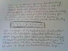 La disgrafía es un trastorno neurológico[2] y una discapacidad del aprendizaje que afecta la expresión escrita y la capacidad de escribir, principalmente a mano, pero también puede repercutir en la coherencia del texto.[3] Es considerada una discapacidad específica del aprendizaje (DEA) y una discapacidad de transcripción, lo que implica que es un trastorno de la escritura asociado con la alteración de la escritura a mano, la codificación ortográfica y la secuenciación de los dedos (es decir, el movimiento de los músculos necesario para escribir).[4] A menudo, la disgrafía puede presentarse en conjunto con otras dificultades de aprendizaje y trastornos del desarrollo neurológico, tales como trastorno del habla, el trastorno por déficit de atención con hiperactividad (TDAH) o el trastorno del desarrollo de la coordinación (TDC).[5]