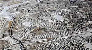 Las urbanizaciones son grandes extensiones de tierra compuestas enteramente por viviendas individuales, lo que las convierte en auténticas ciudades dormitorio. Estas urbanizaciones son, a menudo, engañosamente llamadas aldeas, pueblos o barrios por sus desarrolladores, ya que esos términos denotan lugares que no son exclusivamente de uso residencial.[8]