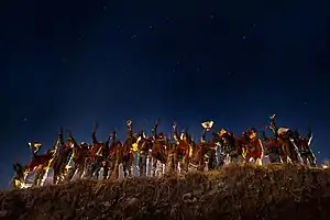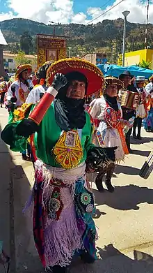 - Q'Apaq Negro: una danza de la época colonial, realizada principalmente por hombres, que recuerda el período de esclavitud de los afroperuanos. Cuenta con lugareños con sombreros redondos, bufandas alrededor de su cintura, pantalones azules, máscaras negras, guantes negros y pequeños cetros con manos negras. La danza simboliza tanto las luchas de la esclavitud; Sus adornos coloridos y piedras brillantes representan la fuerza de los negros en el Perú colonial que se liberan.[9]