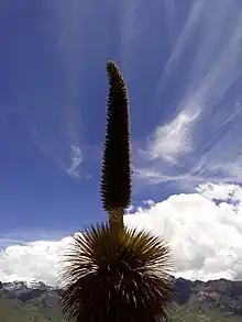 - Se encuentra un bosque considerable de Puya titanca (nombre científico: Puya raimondii),[2] esta especie fue descubierta por Antonio Raimondi de su apellido viniendo el nombre de la planta, estos son endémicos de la zona altoandinas de Bolivia y Perú a altitudes de 3200 a 4800 m s. n. m.