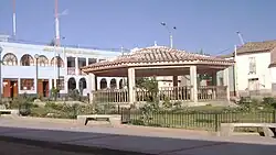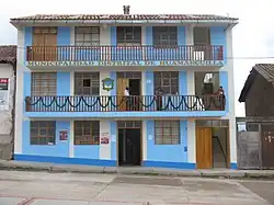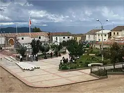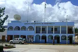 Vista de la plaza Mayor de Huamanguilla, la capital distrital, con el Palacio Municipal al fondo.