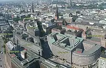 Desde el siglo XVII, la zona está densamente edificada; el resultado fue el llamado Gängeviertel ("barrio de los corredores"), con muchas callejuelas estrechas. La densidad de los edificios aumentó aún más cuando hubo escasez de viviendas tras el incendio de Hamburgo de 1842. En 1892 estalló una epidemia de cólera y las malas condiciones higiénicas del barrio hicieron que la enfermedad se extendiera drásticamente, por lo que se decidió reurbanizar la zona:[2] : 29 Como resultado, muchos habitantes fueron reasentados.[3][4]