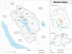 El distrito de Uster limita al norte con el distrito de Bülach, al noreste con Pfäffikon, al sureste con Hinwil, al suroeste con Meilen y al oeste con Zúrich.
