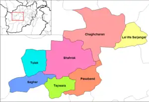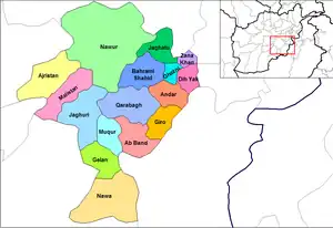 Esta es una lista de distritos de Afganistán, conocidos como wuleswali (en pastún: ولسوالۍ, wuləswāləi; en persa: شهرستان, shahrestān). Estas son unidades administrativas de nivel secundario, un nivel por debajo de las Provincias de Afganistán. El gobierno afgano publicó su primer mapa de distrito en 1973.[1][2] Reconoció 325 distritos, contando wuleswalis (distritos), alaqadaries (subdistritos) y markaz-e-wulaiyat (distritos del centro provincial).[2] En los años siguientes se agregaron distritos adicionales mediante divisiones y algunos se eliminaron mediante fusiones. En junio de 2005, el gobierno afgano publicó un mapa de 398 distritos.[3] Fue ampliamente adoptado como por muchos sistemas de gestión de la información, aunque generalmente con la adición de Sharak-e-Hayratan para un total de 399 distritos. Aquí hay un enlace a una representación limpia de el distrito 399 configurado como una hoja de cálculo (enlace roto disponible en Internet Archive; véase el historial, la primera versión y la última). de una fuente oficial afgana.[4] Sigue siendo el estándar de facto, a finales de 2018, a pesar de una serie de anuncios gubernamentales sobre la creación de nuevos distritos.