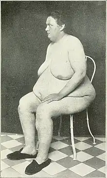 - La adiposidad excesiva, con distribución anormal adiposa en pelvis, tronco y cara. Y en aquellas áreas corporales en donde habitualmente poseemos tejido adiposo, se presentará en mayor cantidad, este signo es visible y fácilmente identificable.[11] Puede estar acompañado por deformidades en manos y pies.[5]