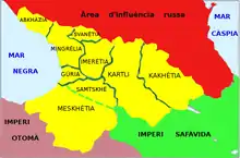 En cierto modo, la historia de la Georgia Oriental a partir de los años 1760 invirtió la historia del Cáucaso por un lado a otro. El 23 de julio de 1783, para distanciarse de la política de dominio de los persas, el rey Heraclio II, cuando gobernaba el Reino unificado de Kartli-Kajetia, firmó un tratado de protección en Gueórguiyevsk, en la frontera con la Ciscaucasia, con el emergente Imperio ruso de Catalina la Grande. Con este tratado se pretendía garantizar a Georgia Oriental una protección total frente a los persas, a cambio los rusos nombrarían un nuevo soberano por este reino. Rusia se comprometía a asegurar la seguridad los territorios de la Transcaucásica del este y a enviar atribuciones reales a los monarcas de Kartli-Kajetia. Los georgianos, por su parte, se comprometían a proveer a Rusia con soldados en caso de guerra contra los persas o los turcos. Pero la condición principal del tratado era que Rusia tenía prohibido anexar a Georgia.[15] Sin embargo, Rusia faltó a su palabra. A la muerte del rey Jorge XII, el zar Alejandro I de Rusia no reconoció el príncipe heredero David.[16] El 12 de septiembre de 1801, el mismo zar firmó el manifiesto que anexaba oficialmente Kartli-Kajetia. Hizo deportar a los príncipes reales a Rusia, antes de emprender la conquista del resto del Cáucaso. El tratado de protección de 1783 se convirtió en el manifiesto de la pérdida de la independencia georgiana. En febrero de 1810, el Imperio ruso anexó el Reino de Imericia, y luego continuó apoderándose de los pequeños principados: Guria (1829), Mingrelia (1857/1867), Svanetia (1858) y Abjasia (1865).