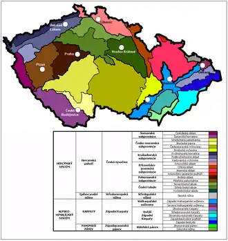 En términos de división geomorfológica, la República Checa es un territorio muy diverso, situado en el territorio de cuatro provincias geomorfológicas dentro de cuatro subsistemas geomorfológicos. El macizo de Bohemia, dentro del subsistema del bosque Hercínico, forma tres cuartas partes del país. La parte sudoriental y oriental del territorio checo pertenece a los Cárpatos occidentales dentro de los Cárpatos. Las dos provincias restantes, la Cuenca Panónica Occidental dentro de la Cuenca panónica y la llanura nordeuropea dentro de la gran llanura europea, abarcan sólo una pequeña parte del territorio checo en el sureste y el noreste.