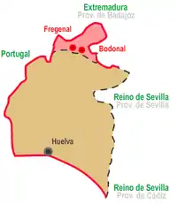 La provincia de Huelva se formó agrupando las poblaciones del Reino de Sevilla que no fueron agregadas ni a la provincia de Sevilla, ni a la de Cádiz, ni a la de Málaga.[2]