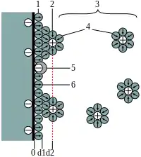 Se piensa que la región de la doble capa que está en la solución está hecha de otras capas más delgadas. La más cercana al electrodo es llamada capa interna, contiene moléculas del solvente y otras especies que se denominan adsorbidas específicamente. Esta capa interna también es llamada capa compacta, de Helmholtz o de Stern. La zona en donde se encuentran los centros eléctricos de los iones adsorbidos específicamente se llama plano interno de Helmholtz (PIH) y está a una distancia d1. Los iones solvatados pueden acercarse al metal hasta una distancia d2. La zona donde se encuentran los centros eléctricos de los iones solvatados más cercanos es llamada plano externo de Helmholtz (PEH). La interacción de los iones solvatados con el metal cargado son de "larga distancia", por lo que estos iones se denominan no adsorbido específicamente. Debido a la agitación térmica en la solución, estos iones no adsorbidos específicamente se distribuyen en una región tridimensional que va desde el PEH hasta el resto de la solución, esta zona es llamada capa difusa.