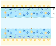 Más tarde Gouy y Chapman (entre los años1910 y 1913) aportaron una serie de modificaciones al considerar que los iones se acomodan a lo largo de un espesor de solución finito conocido como la capa difusa, ligada a la agitación térmica y con la función de balancear la carga del electrodo. En este modelo el potencial superficial disminuye exponencialmente debido a la adsorción de los contraiones presentes en la disolución.