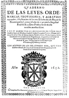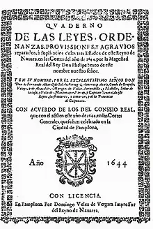 ![]() Cuaderno de las leyes de las "Cortes Generales" reunidas en Pamplona en 1644, impreso por Domingo Vélez de Vergara, "Impressor del Reyno de Navarra" | ||