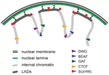 Los dominios asociados a la lámina (LAD) son partes de la cromatina que interactúan en gran medida con la lámina, una estructura en forma de red en la membrana interna del núcleo.[34] Los LAD consisten principalmente en cromatina transcripcionalmente silenciosa, enriquecida con Lys27 trimetilada en la histona H3 (también denominada H3K27me3), que es una modificación de histona postraduccional común de la heterocromatina.[35] Los LAD tienen sitios de unión a CTCF en su periferia