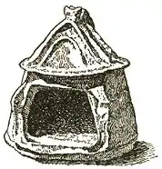 Su forma arcaica es conocida por las urnas funerarias encontradas en las necrópolis del antiguo Foro Romano, las cuales tenían forma de una cabaña redondeada con una única habitación. Los vestigios encontrados en el Monte Palatino y datados en el siglo VIII a. C. confirman esta inicial planta arquitectónica tan modesta.
