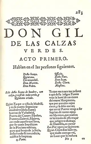 ![]() Página de la Quarta parte de las comedias del Maestro Tirso de Molina en que comienza Don Gil de las calzas verdes. | ||