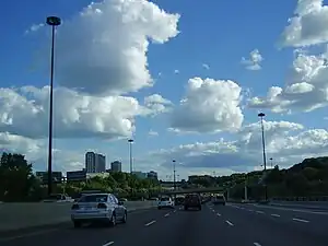 ![]() Vista de la Don Valley Parkway hacia el sur, en el intercambio con la Lawrence Avenue. | ||