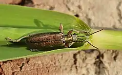 Posee un cuerpo alargado de aproximadamente 12 mm, siendo las hembras son más robustas que los machos. Su coloración es verdosa o cobriza y cada uno presenta una banda central longitudinal roja o azul.