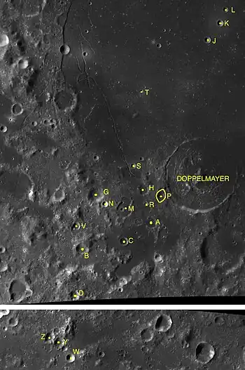 Por convención estos elementos son identificados en los mapas lunares poniendo la letra en el lado del punto medio del cráter que está más cerca de Doppelmayer.