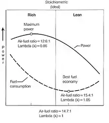 Cualquier mezcla con relación aire–combustible superior a 14,7:1 se considera una mezcla pobre; inferior a 14,7:1 es una mezcla rica, considerando gasolina compuesta únicamente por n-heptano e isooctano). En realidad, la mayoría de los combustibles se componen de una combinación de heptano, octano y otros alcanos, además de aditivos que incluyen detergentes y posiblemente oxigenadores como el MTBE (metil terc-butil éter) o el etanol/metanol. Todos estos compuestos alteran la relación estequiométrica, y la mayoría de los aditivos modifican la relación a la baja (los oxigenadores aportan oxígeno adicional a la combustión en forma líquida que se libera en el momento de la combustión. Para la gasolina con MTBE, la relación estequiométrica puede disminuir hasta 14,1:1. Los vehículos que utilizan sensores de oxígeno u otros circuitos de retroalimentación para controlar la relación aire–combustible (control lambda), compensan automáticamente este cambio en la relación estequiométrica del combustible midiendo la composición de los gases de escape y controlando el volumen de combustible. Los vehículos sin dichos controles (como la mayoría de las motocicletas hasta hace poco, y los coches anteriores a mediados de la década de 1980) pueden tener dificultades para funcionar con ciertas mezclas de combustible (especialmente los combustibles de invierno que se usan en algunas áreas) y pueden requerir el empleo de diferentes surtidores de carburante (o una alteración en las proporciones de combustible). Los vehículos que disponen de sensores de oxígeno pueden controlar la relación aire–combustible con un medidor.