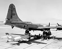 B-29 (variante P2B) en soportes para acomodar al Skyrocket.