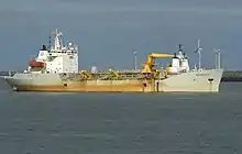 - La draga de succión en marcha va succionando lentamente mientras se mueve a menos de 1 nudo a la hora por la zona de dragado.[3] El tubo a diferencia de las otras dragas de succión mira a popa. Puede transportar entre 750 y 10 000 metros cúbicos y se hace con bombas sumergidas para disminuir la longitud de la tubería de aspiración. Los materiales que succionan se limitan a arenas; si contienen algo de limo, el rendimiento baja mucho. Generalmente produce peores rendimientos que las estacionarias porque éstas generan un escalón que facilita la disgregación del material.